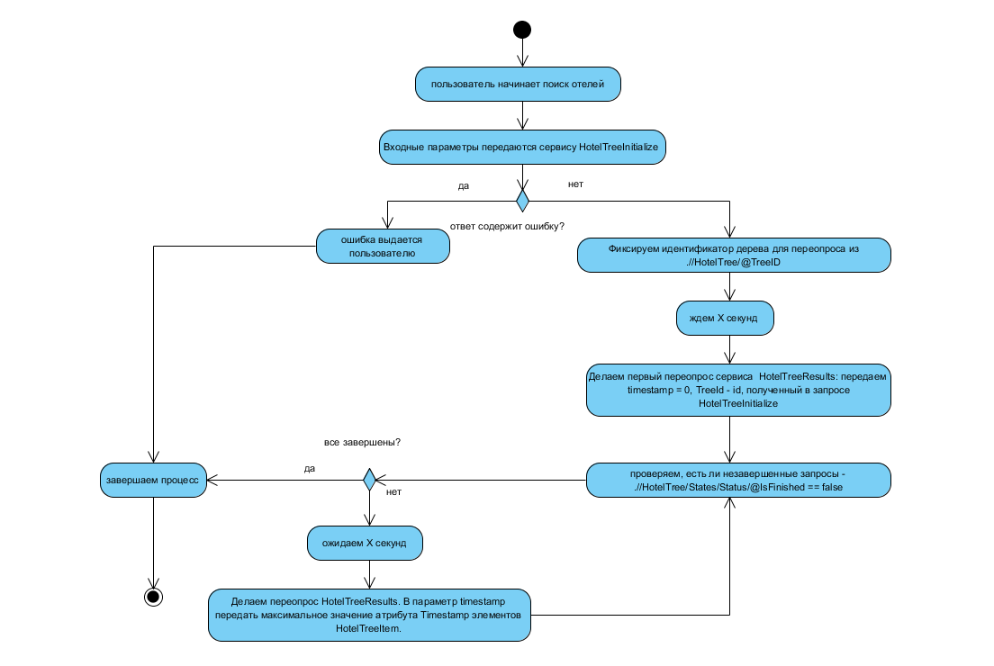 Сервис HotelTreeInitialize является первым шагом бизнес-процесса поиска гостиниц, он возвращает идентификатор отельного дерева, которое потом следует переопрашивать методом HotelTreeResults.